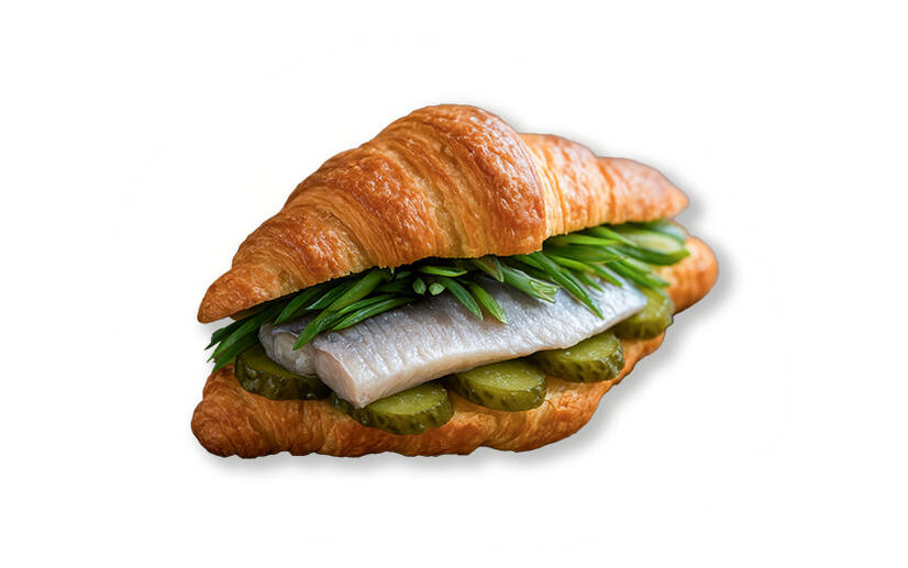 Склад - ароматний круасан з філе оселедця Матьє Poyal, вершковим маслом з часником, маринованим огірочком та свіжою зеленою цибулею, вага - 140 г