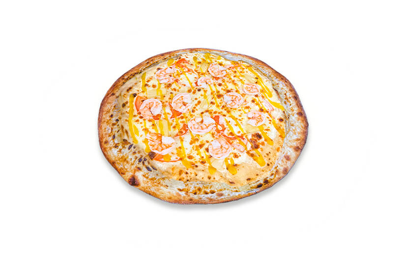 Склад - ферментоване тісто, соус вершковий, помідор, ананас, сир моцарела, креветка, соус манго