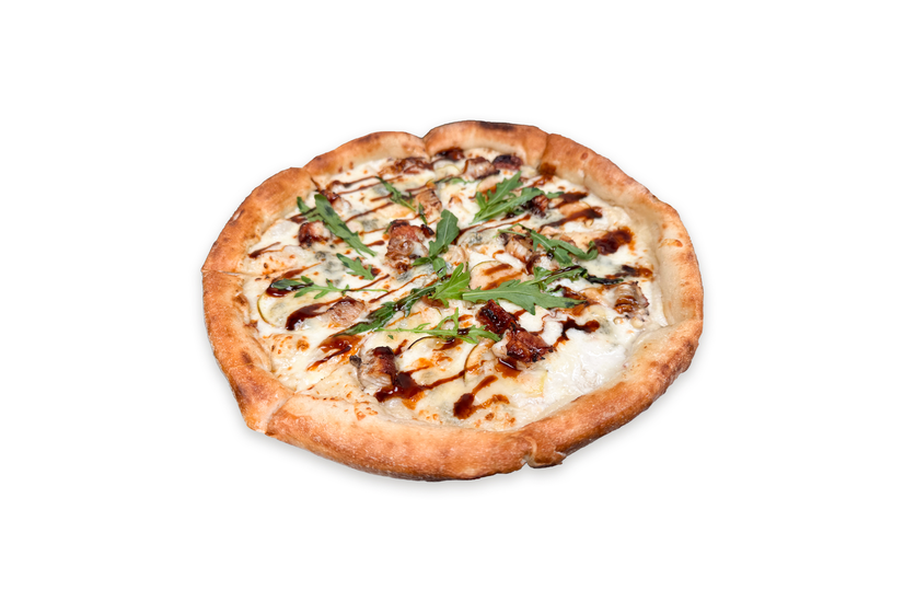 Склад: ферментоване тісто, соус вершковий, вугор, сир моцарела, соус теріякі, борошно семола, сир горгонзола, груша, салат руккола