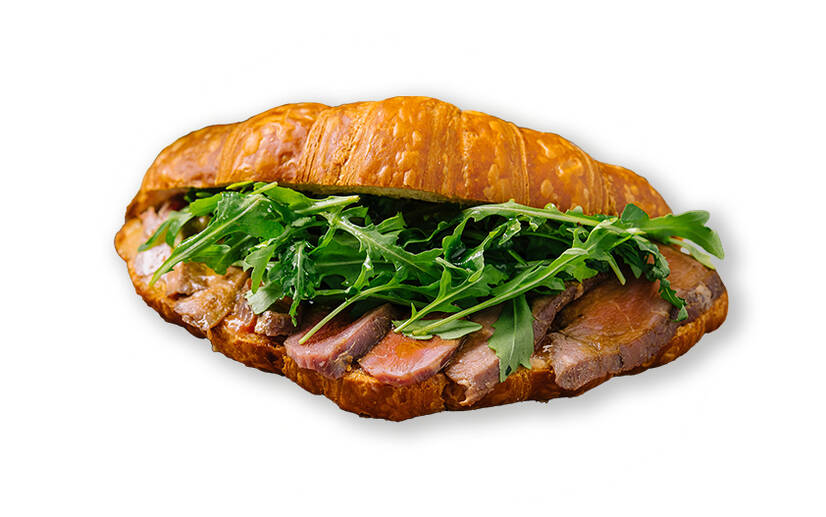 Склад - Фірмовий круасан з яловичиною су-від, ніжним крем-сиром, соусом тоннато, каперсами, пармезаном, свіжим помідором та руколою, вага - 165 г